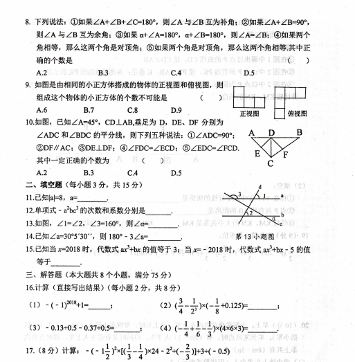 河南駐馬店泌陽2017-2018七期末上測試數學(圖片版)(2)